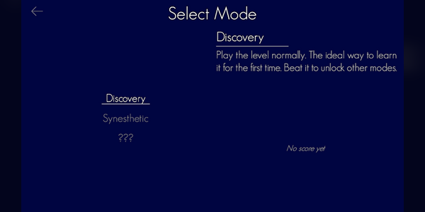When I made the video above, the only screens I had were a rough version of the title screen, and the settings screen. New screens have been added since: the mode selection, and the credits. The first one allows the player to chose one of the 3 modes that will be available in the game: Discovery (the default one), Synesthestia, and Free. I'll talk more about them in a future update! In the long run, this screen will also serve as a level selection. Its design is now complete, but it lacks some functionalities: as there will be locked content and score, I'll have to update its display according to the save state, once it is implemented. The credits screen is much more straightforward: a scrollable content in which I list the assets used in the game. I hoped this would be displayable in a single screen, but it turns out there is just too much assets for that! It's a good thing I've kept them in a file so that I can write this list down. A useful tip when you're making a game: as soon as you start developing, keep a file somewhere to list all the tools and assets you used, as well as the people who helped making it. It'll way better to have it once you need to credit them rather than trying to remember all of them!