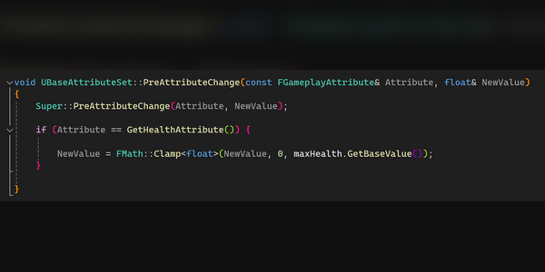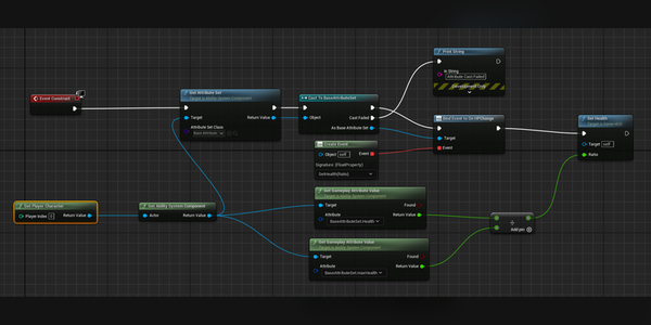 One of the issues we ran into was converting the Health to use this system, since you can store float values in the Attribute Set, you would use this rather than a Health Component. While I was offline, my team had difficulties getting the player health to update in its respective UI Widget and to update the Health Attribute when damaged. I reviewed the blueprint they were working with, and found that they were unable to bind the OnHPChange delegate used that should broadcast on the attribute change.