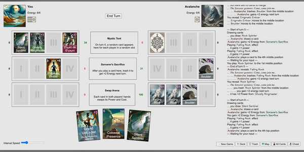 We quickly moved on from paper prototypes. There was just too much stuff to keep track of given the mechanics we had in mind. We specifically wanted to replicate Dominion's crazy combos, which would produce screens and screens of logs on Isotropic. We need an implementation that we could play on a computer. Michał put together a prototype over Easter and we started exploring different concepts.