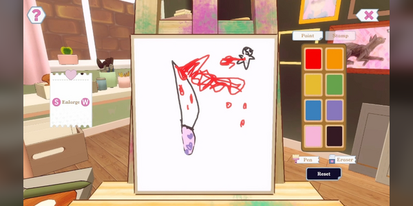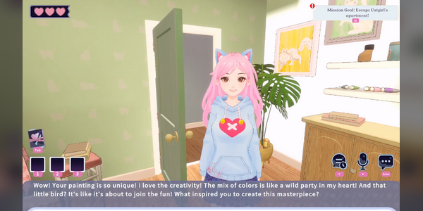You can also look forward to the interactive painting minigame. Players can draw anything on the catgirl's art studio canvas and watch her AI brain react to it! Notice how she mistook our derpy stab victim for a little bird...