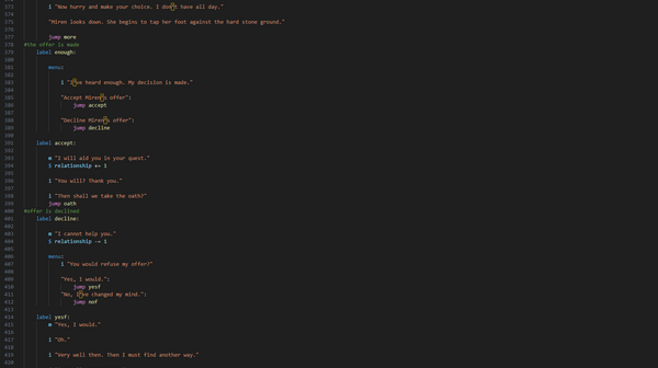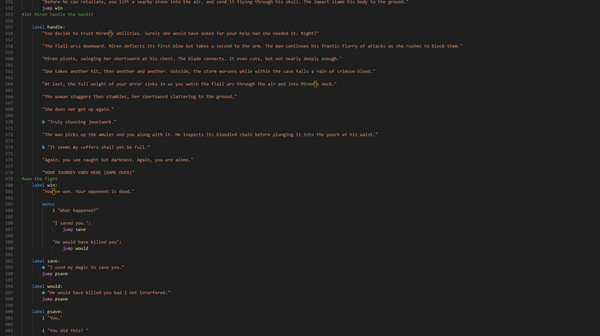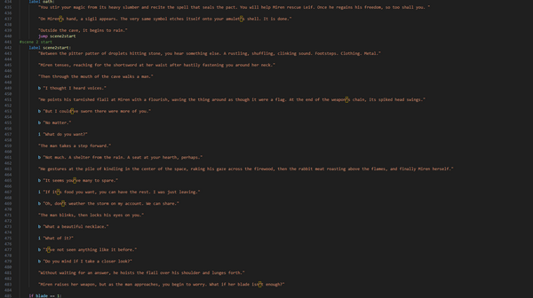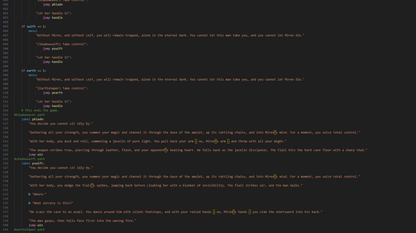 A lot of this week was implementing our Twine prototype into Ren'py, as well as implementing mechanics such as the different spell paths you can choose and figuring how to put them in. It wasn't too difficult either with putting in a variable of what spell path you wanted in the beginning of the game. And with our Twine prototype, we did get feedback and there is stuff that needs changed to correlate with the concerns we got. Which will be some of the goal this upcoming week, and will be gradually put in if time will allow it.
