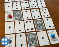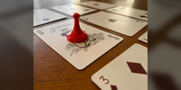 After completing a game with a 5x5 board, we immediately tested a 7x7 board with the same rules. I just doubled the deck, so there were eight of each rank and one joker. This made for a longer game, but using playing cards made it quite the table hog. We enjoyed the 7x7 board better. I won both games, and my strategy was to keep placing the pawn on the higher number cards so my opponent always had to make big moves.
