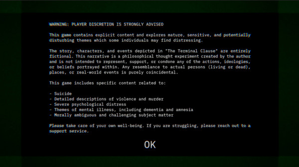 Hello everyone, and welcome to the official devlog for "The Terminal Clause". My name is Oleksandr, and I'm a solo developer creating a short, narrative-driven psychological thriller about memory, morality, and consequence.