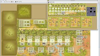 J'avance doucement sur les cartes terrains et lieux. Tentative de roussettes au format SVG. Quelques tuiles action ont été scannées. J'ai utilisé des decks...