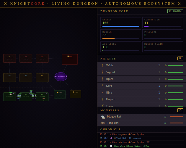 The sequence it captures: Phase 1 (4 sec) — Full dungeon overview. Knights visible on the SVG map moving between rooms, combat log scrolling with kills and XP...