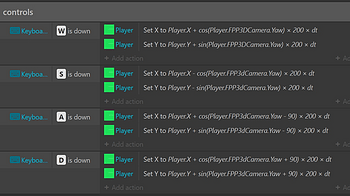 W — Player.X + cos(Player.FPP3dCamera.Yaw) * 200 * dt Player.Y + sin(Player.FPP3dCamera.Yaw) * 200 * dt S — Player.X - cos(Player.FPP3dCamera.Yaw) * 200 * d...