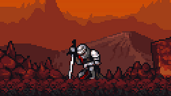 A worn and weary knight lies broken on the ground, his tarnished sword propped beneath his weary frame. A tattered black cloth wraps around his battered waist...