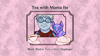 Image of Mama Ite and Roil in a bordered window, teacup on the lower left and scone on the lower right. Image Credit: Mama Ite profile is by Bubblegum Patty . R...