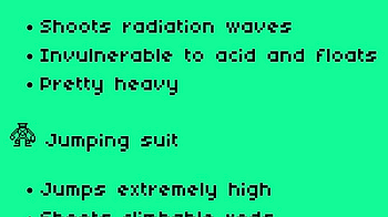 New spacesuits: Radioactive suit! Slowest and clunkiest but has arguably the most powerful weapon: radiation itself. Damages not by shooting projectiles, but sl...