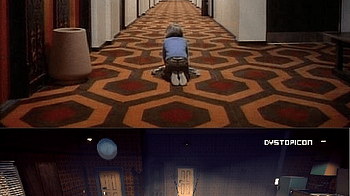 To create the Dystopicon room we wanted to use the door as a vanishing point. It is the place that the player looks at and the central axis of the composition...