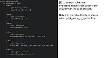 Since I got asked about the hamburger for the quick menu buttons, I'm sharing my code here. As it's not so long ago that I've started learning Ren'Py, I can't g...