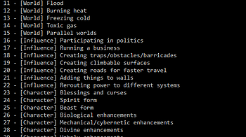 Categories: [0] Group, [1] World, [2] Influence, [3] Character, [4] Navigation, [5] Thinking, [6] Combat, [7] Items, [8] Goal, [9] Miscellaneous New category: [...