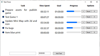 New features: Sound alarm when a task complete Allow editing the current time spent, the goal of each task by double-click Autocorrect time format "HH:mm:ss" Fi...