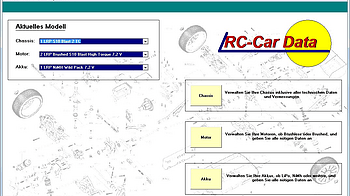 HAUPTMENÜ Im Hauptmenü befindet sich auf der linken Seite 3 blaue Auswahlfelder für das aktuelle Modell. Jedes Modell (Chassis, Akku, Motor) welches neu ange...