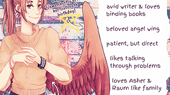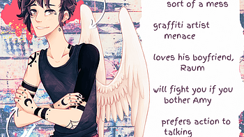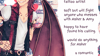 Up next for character introductions is Raum! Raum is Asher's boyfriend, devil wing, and tattoo artist! He likes stabbing art into people and also likes art stab...
