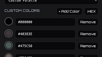Update v0.5.1 Allow manual palette creation from inside the tool (select “Custom Palette” in Palette Mode) Allow “Custom Palette” to be exported as .HEX...