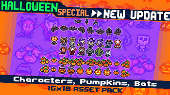 One week to Halloween and the first update is here: Characters, Pumpkins and Bats. 40 new 16x16 assets to use it in your spooky adventures in top down games, RP...