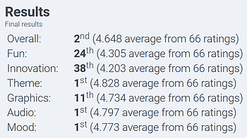 Here's our results from Ludum Dare! 2nd overall and three gold medals! I wish I had time to do more tutorialisation because I feel that our Fun suffered there a...