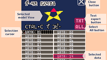 About PELOGEN2 3D model data PELOGEN2 data is managed using sprite data for Pico-8. Paste it into Pico-8's sprite editor and use it. Interface Selected model Vi...