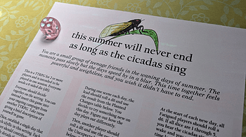 Hello! I've reworked As Long as the Cicadas Sing to be a one-page game! Originally released a couple years ago as a business card game, I wanted to expand the g...
