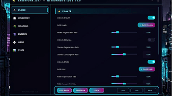 ⚡ CYBERPUNK 2077 — CHEAT/TRAINER 55 features • Neon UI • Press [INSERT] in‑game ⚡ PLAYER MODULE (16) Unlimited Health, Stamina, RAM Refill Health...