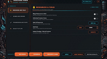 Fracture Field Cheat — Quarry Mastermind Activation: Press [INSERT] in‑game to open the trainer menu. 📋 Overview Total features: 18 · Modules: Resources...