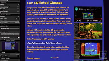 TLDR: Use OBS Studio Virtual Camera to "stream" the desktop or game, inside CRTinted Glasses enable webcam support. After long consideration on how Wayland supp...