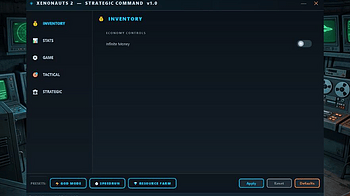 Xenonauts 2 – Strategic Command Trainer v1.0 Activation: Press [INSERT] in‑game to open the trainer menu. 💰 INVENTORY MODULE Infinite Money – unlimited...