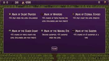 Added the mask selection screen (later one should unlock the other). Also added a stats screen, when the player clicks on a follower or priest it shows details...
