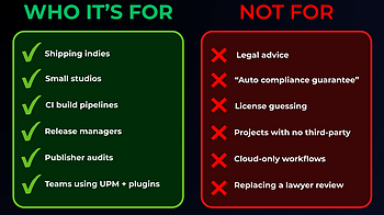 I’ve been building GameCompliancePack , a Unity Editor extension that scans a Unity project for third-party components (UPM dependencies, Asset Store plugins...