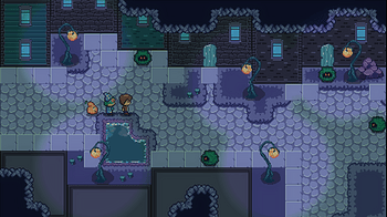 Say hello to Shroomba, our local fruit-selling mushroom. I also implemented the first puzzle where you grow flowers across the water to move forward. Small step...