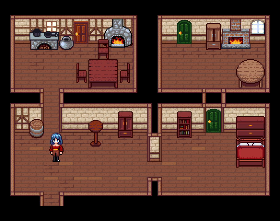 Added more furnitures to interior tiles, including pots, barrels, bookshelf, closets, beds, and kitchen...
