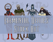 4 illustrations of figures inspired by Fire, Earth, Water, and Air