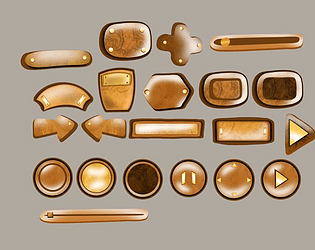 A 2D UI asset pack with wooden textured buttons and other UI elements
