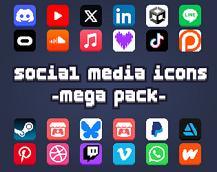A pixel-art pack of 50 social media logos at 32x32, designed as ready-to-use clickable buttons.