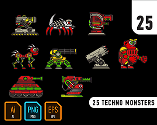 25 high-quality robots. This asset is perfect for a side scrolling game, or even a turn based RPG type game.