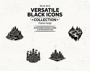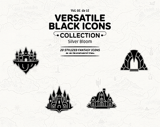 20 powerful black fantasy icons — mountain fortresses, sacred forges, and dwarven citadels in minimalist form.