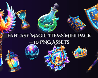 A high-quality set of 10 hand-crafted fantasy magic items designed in vibrant cartoon style.