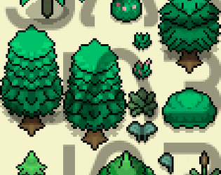 Cozy 2D pixel art asset pack with a house, trees, bushes and a full tilemap set