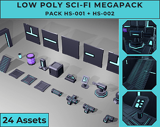 24 modular low poly sci-fi props. Bundle of Pack HS-001 + HS-002. Perfect for games, prototypes, and level design.