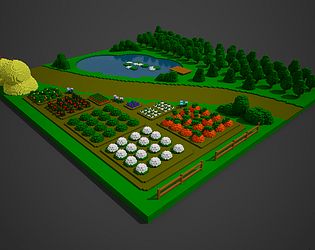 Neatly organized park with a fountain. Trees, bushes, hills and touch of flowers here and there.