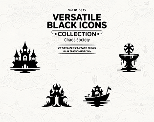 20 stylized black icons for maps and worldbuilding — chaos, ambition, and ruin in solid silhouette.