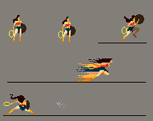 The 8 animation of Wonder Woman 32x32 pixel art (Attack, Defence, Die, Fast-run, Hurt, Idle, Jump, Run)