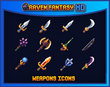 A 16x16, 32x32 and 64x64 beautiful potions and weapons icon pack for your game to use