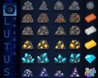 A game assset pack containing 2d pixel ores and rocks