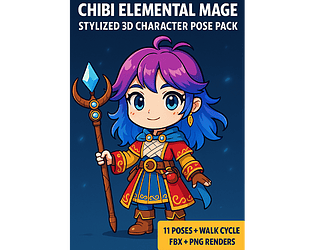 Stylized chibi mage 3D character with 11 custom poses and walk cycle, perfect for fantasy / RPG projects
