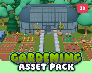 A 125+ low-poly models with tools, pots, modular greenhouse pieces, and plants with growth stages.