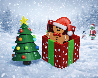 A cozy low-poly Christmas 3D pack with a decorated tree and a cute gingerbread gift character.