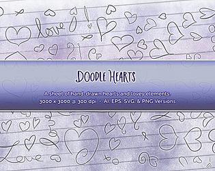 A sheet of hand-drawn hearts and lovey elements, in vector and raster formats.