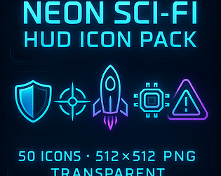 50 high-tech sci-fi HUD icons. Each icon is rendered at 512×512, features transparent backgrounds.